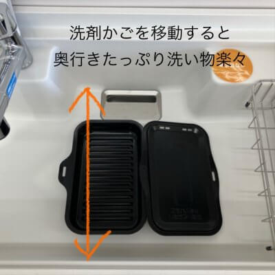 洗剤ラックは位置を変えることもでき大きな洗い物も奥行きたっぷり有効活用🍲