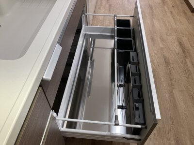 収納は底板ステンレスで汚れが染み込みにくくなっており、立てて収納できる小物ポケットもたっぷり🥢